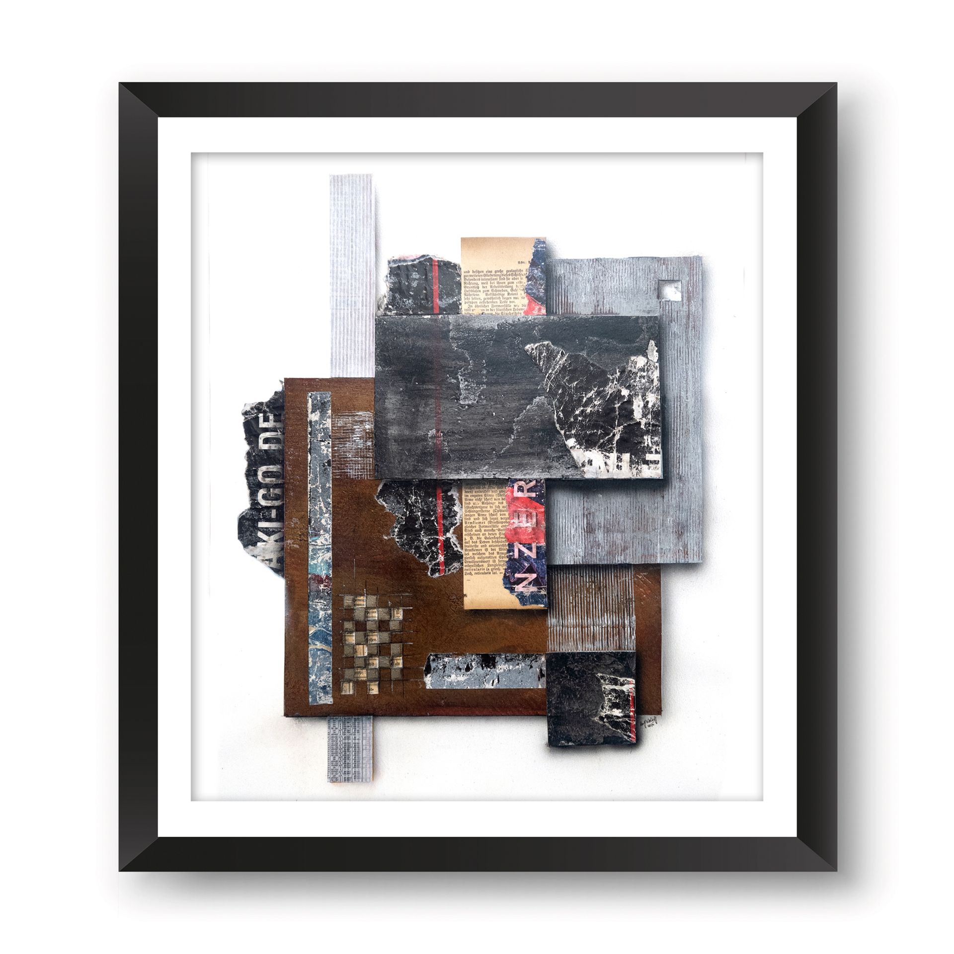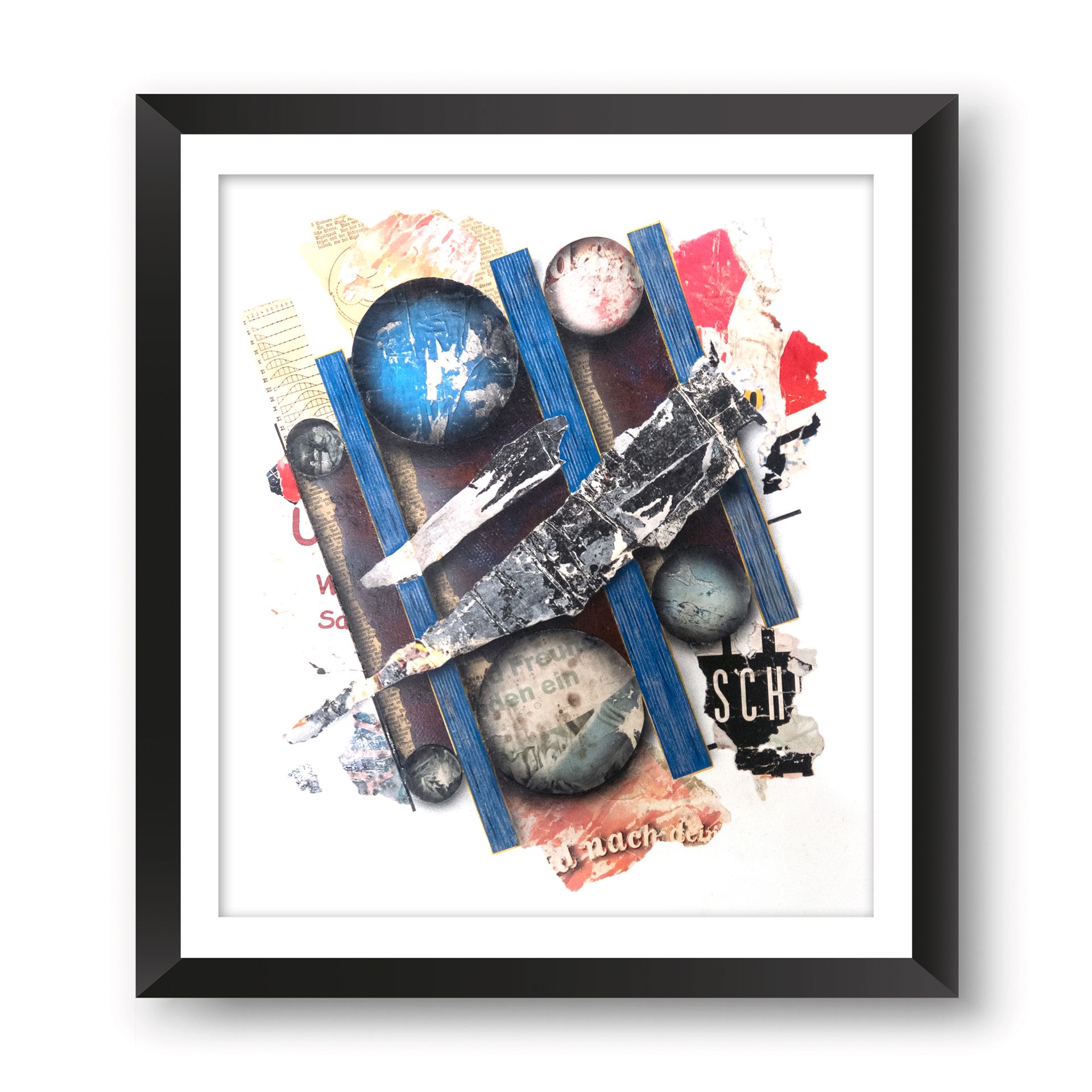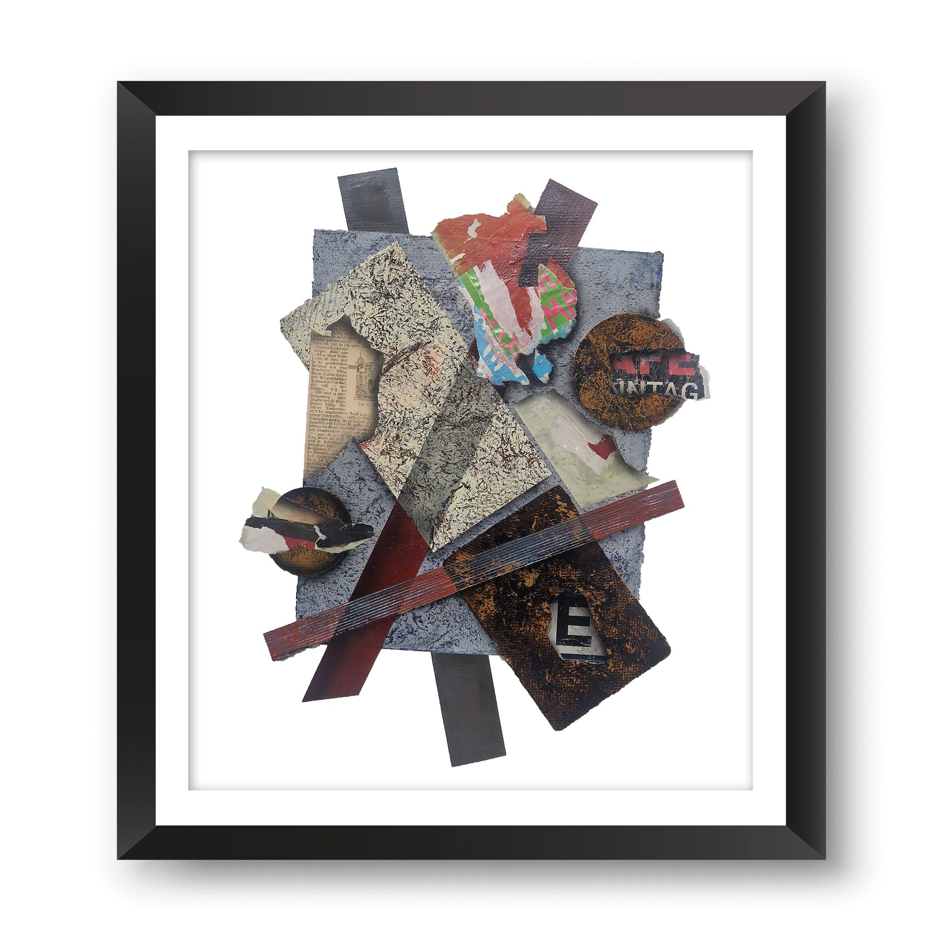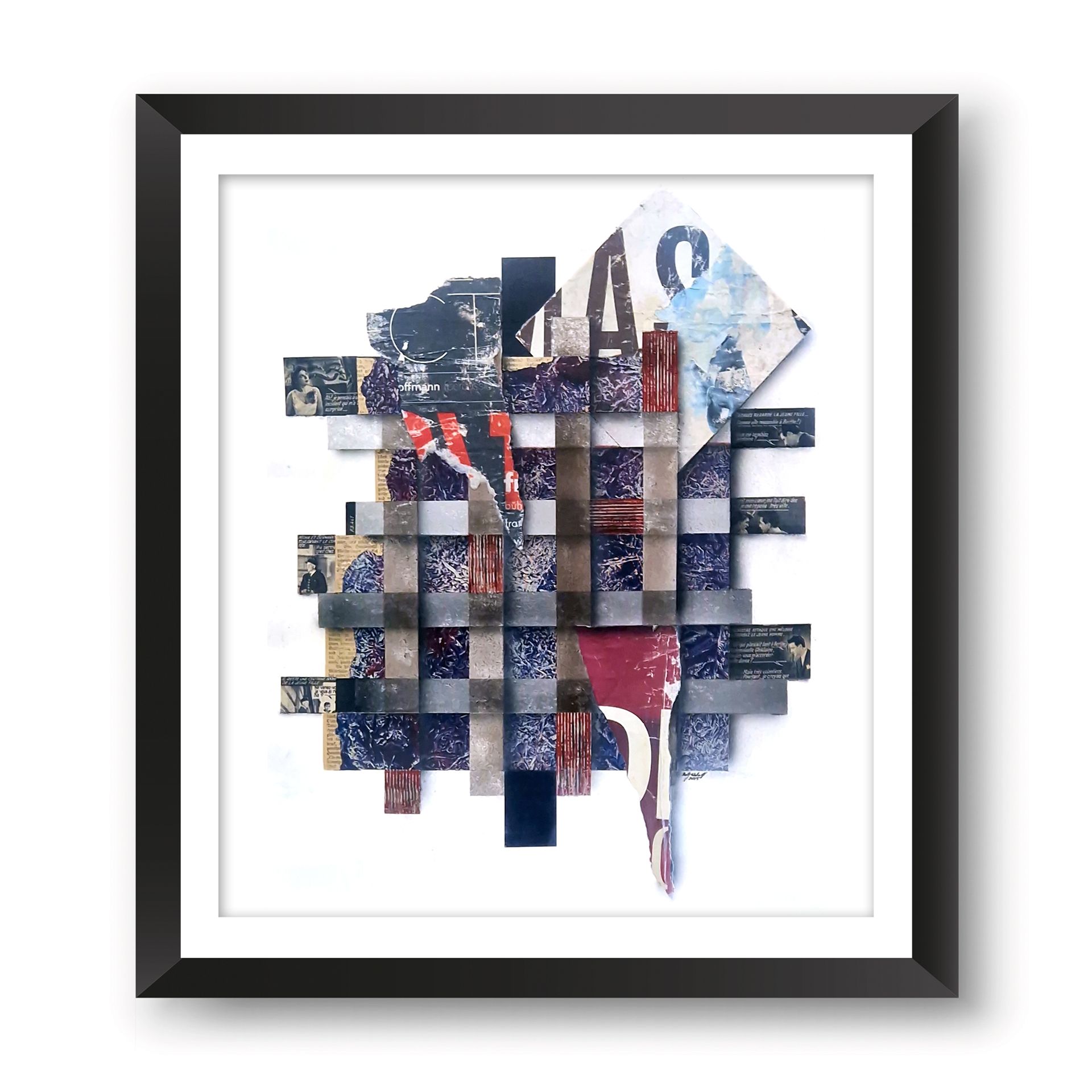 Klar definierte, oft geometrische Elemente bilden das Grundgerüst für den Bildaufbau. Diese Strukturen wirken wie ein Netz, das den Blick des Betrachters lenkt, und ihm Orientierung gibt. Durch die partielle Verwendung des Strukturdrucks treten unter anderem abstrahierte Linienmuster und geometrische Formen in einen Dialog mit der Farbe. Diese setzt gezielt Kontraste, akzentuiert bestimmte Bereiche und erzeugt so dynamische Spannungen im Gesamtbild. Der Einsatz von Farbtönen und Plakatabrissen – sei es in intensiver Plastizität oder in gedämpften Nuancen – verstärkt die emotionale Wirkung der Komposition.